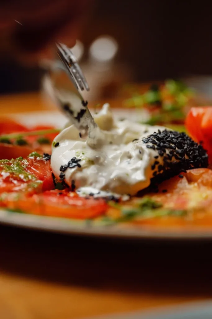 chèvre frais, fondue de poireaux crémeuse, radis colorées en pickles, vinaigrette miel & moutarde, salade d’herbes